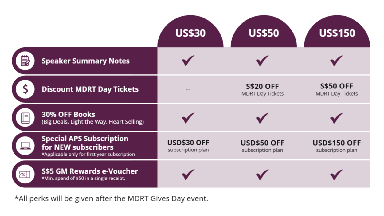 US$50 Donation: Speaker Summary notes, $20 off MDRT Day Singapore ticket, 30% off Books: Big Deals, Light The Way and/or Heart Selling, US$50 off Adviser Playschool first-year subscription for new subscribers,  $5 GM Rewards E-Voucher (Terms apply)Â